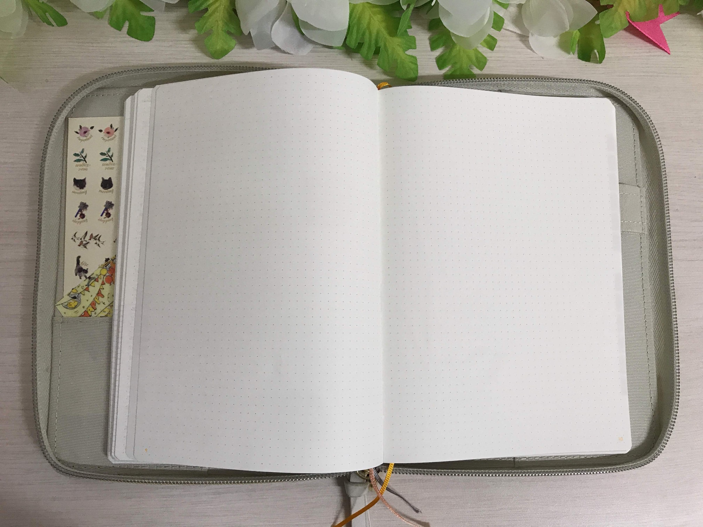 月曜はじまりで土日も同幅タイプ。上半分が無地のスペース、下半分が方眼メモとなっていて、自分に合わせてゆるく使いやすいのが特徴です。